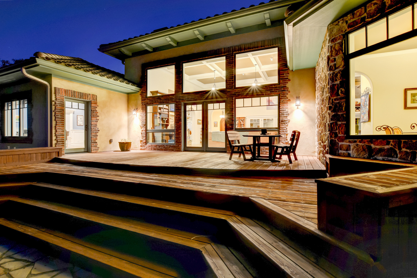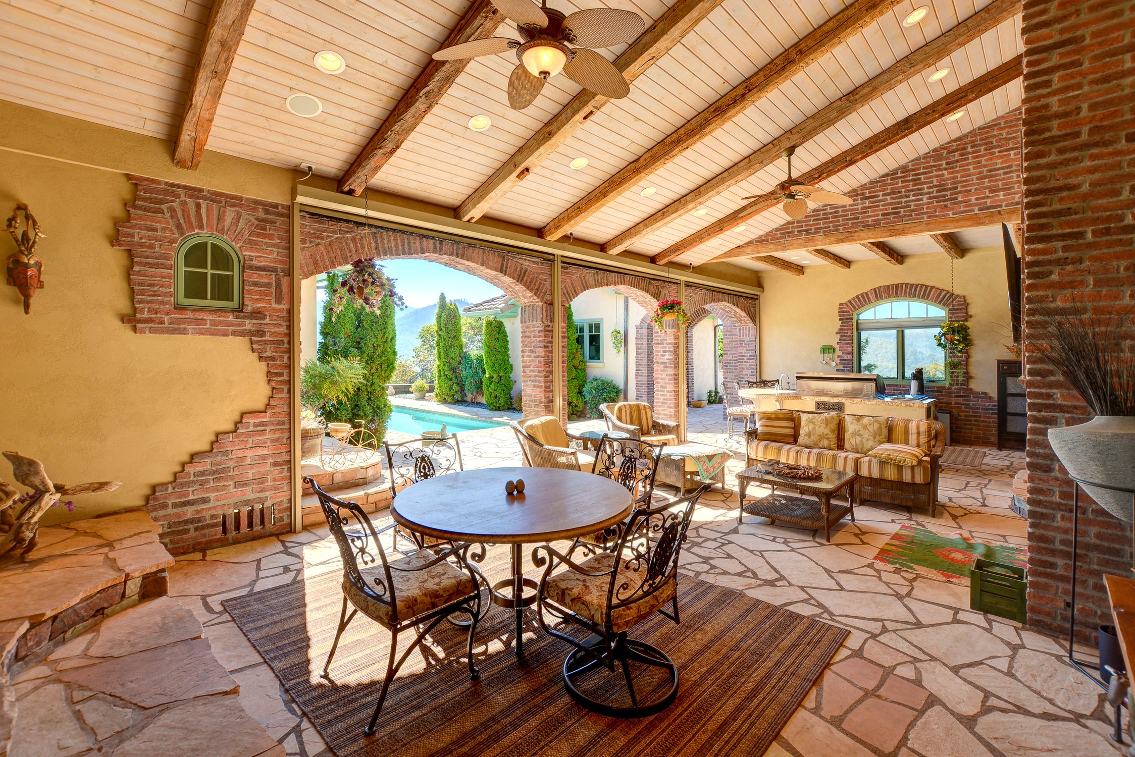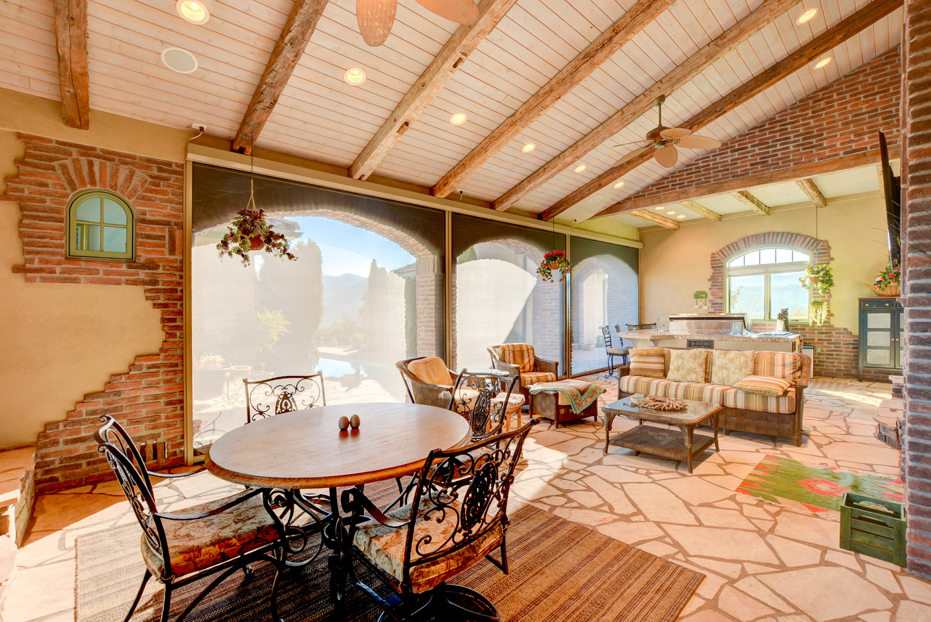 Left to right: dining room, lanai, living room, and lanai with shades drawn.